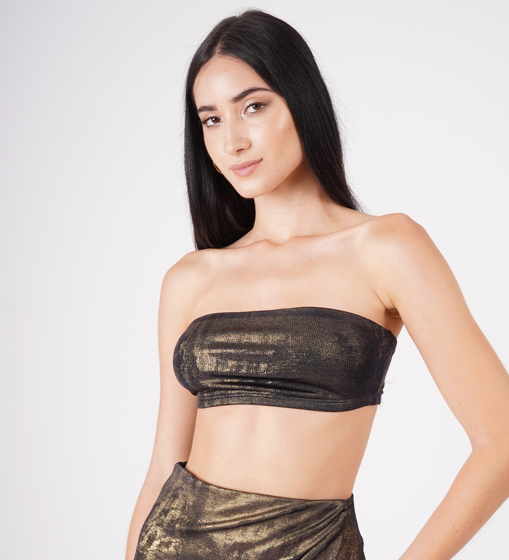 Create your outfit of the night with Mayra! Versatile blue-gold strapless top. With a removable flower detail and adjustable neck. Produced in a sustainable factory and handmade by Peruvian artisans.