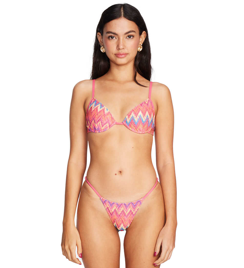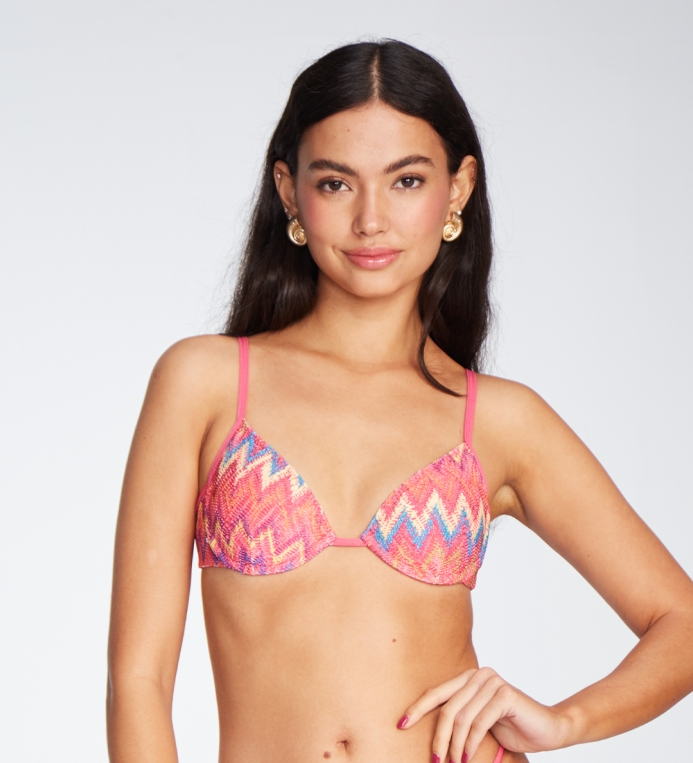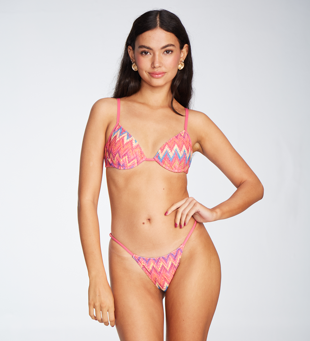 Beachy vibes with our Melody Zigzag bikini. Designed to enhance your figure, it combines a cute pink color with a multicolor zigzag print and a unique texture. Perfect for those looking for comfort and style, produced in a sustainable factory and handmade by Peruvian artisans.