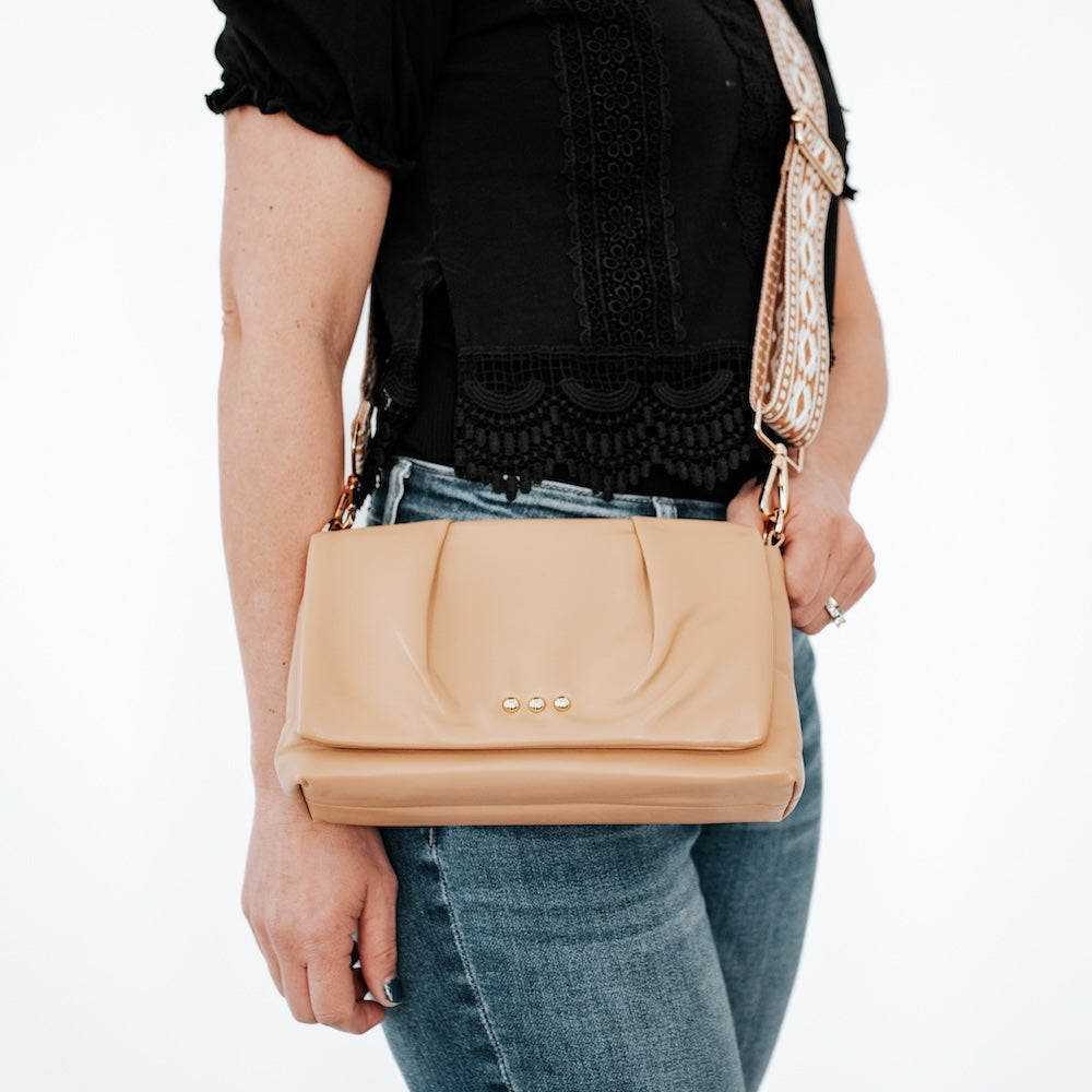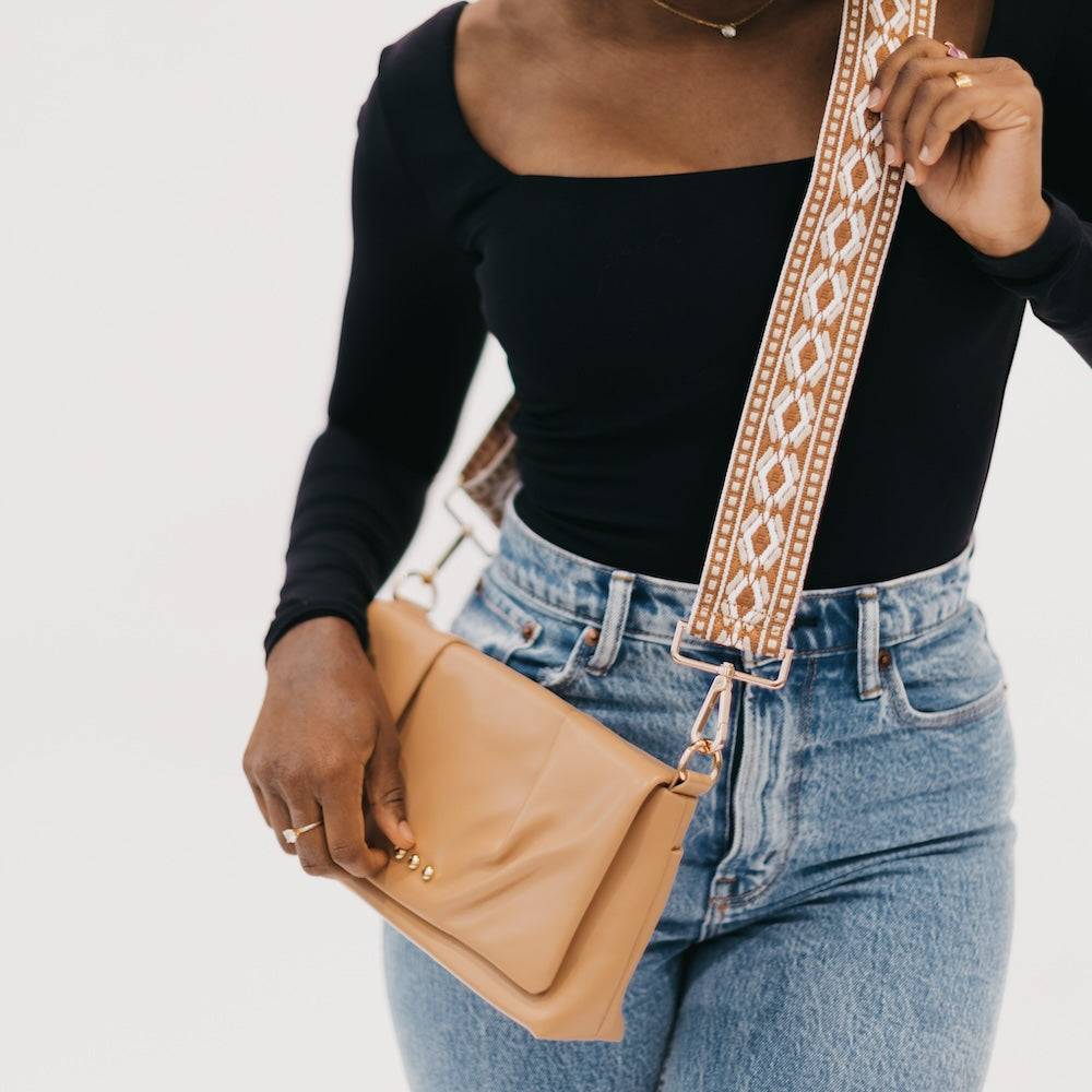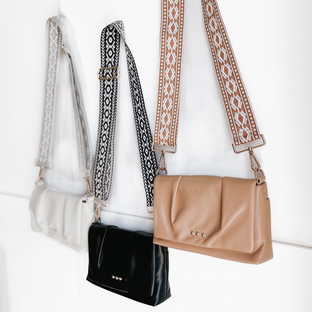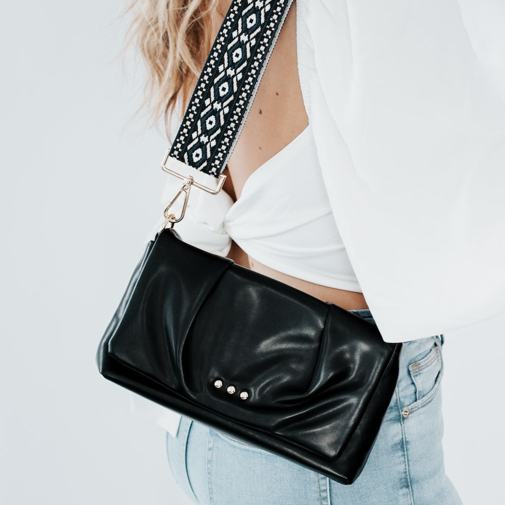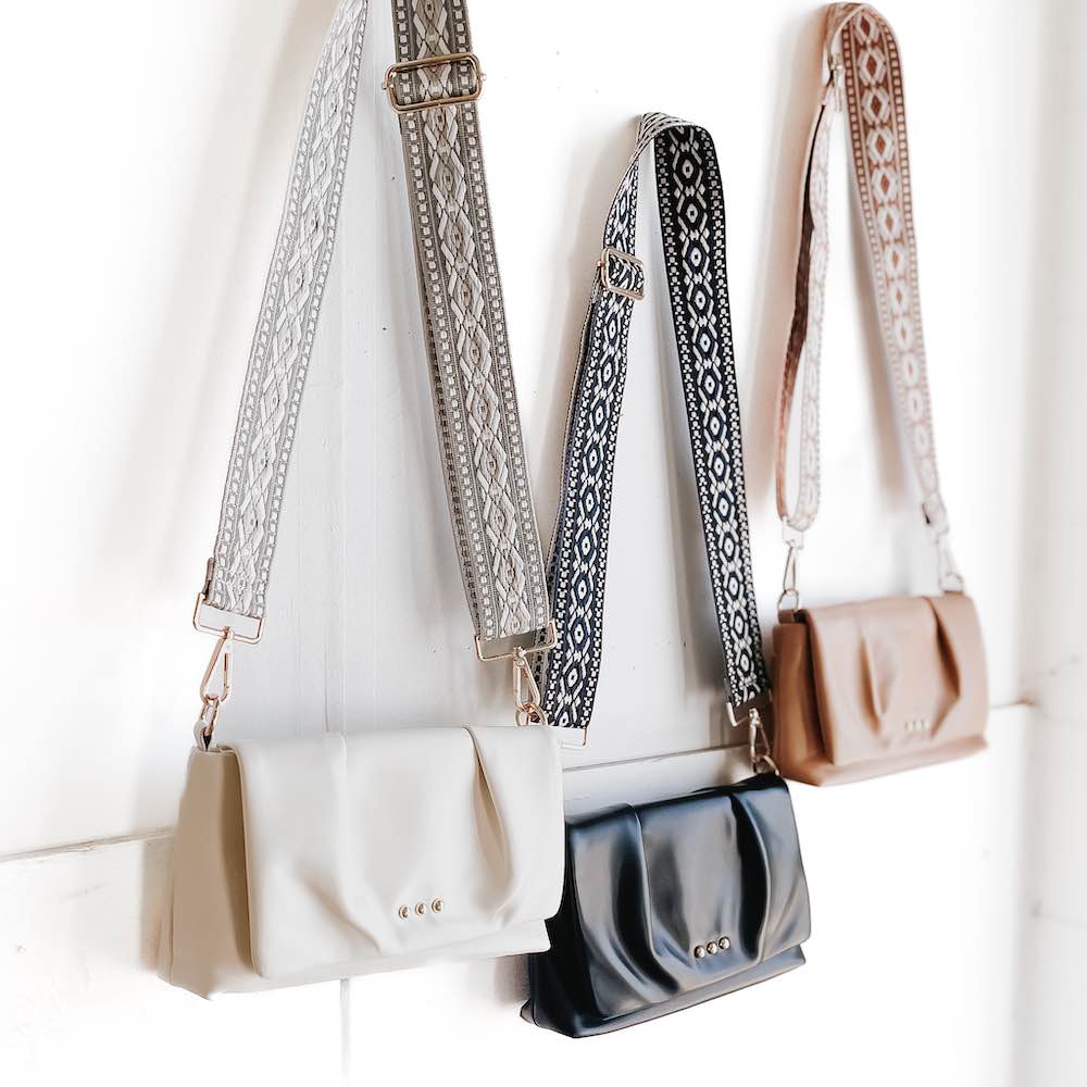Introducing our Aurora Crossbody Clutch Bag - the perfect mix of classy, elegant, and chic! This bag includes a neutral, adjustable and removable sage, cream, and tan canvas guitar strap, an exterior pocket with a snap closure on the back, and a zipper pocket in the interior. The Aurora Crossbody Clutch bag can be worn as either a crossbody or as a clutch bag, making it the perfect accessory for any dressy or casual occasion. Available in 3 colors including cream, brown, and black!