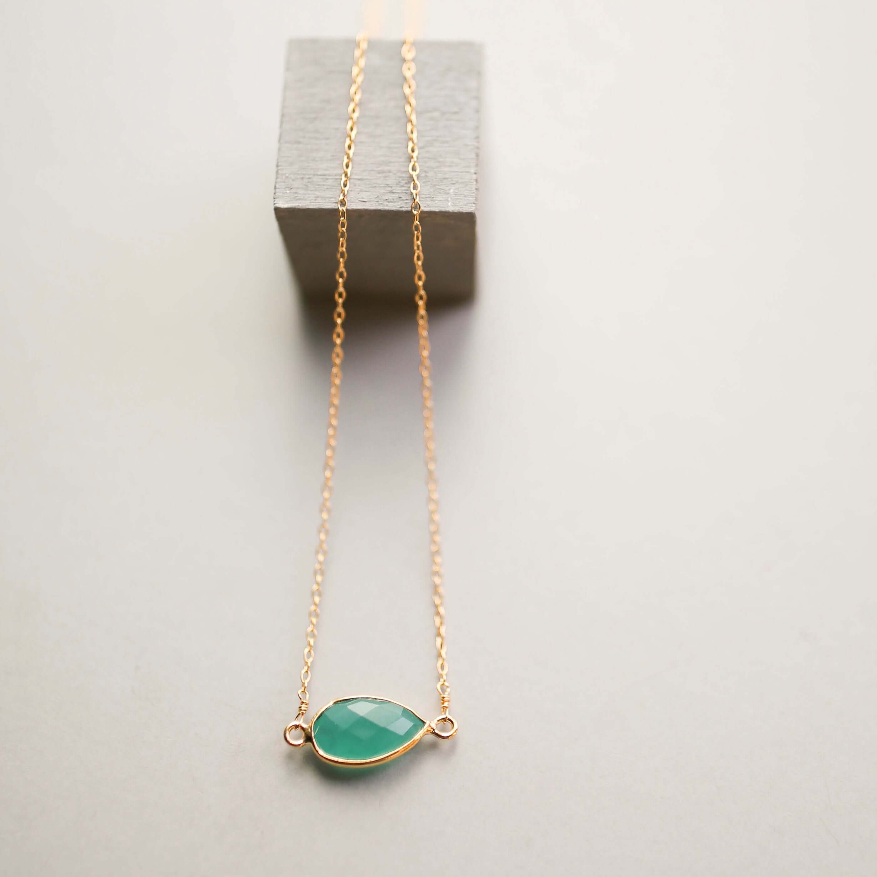 Simple, gold minimalist necklace with a beautiful green apatite bezel set stone. Great for layering.