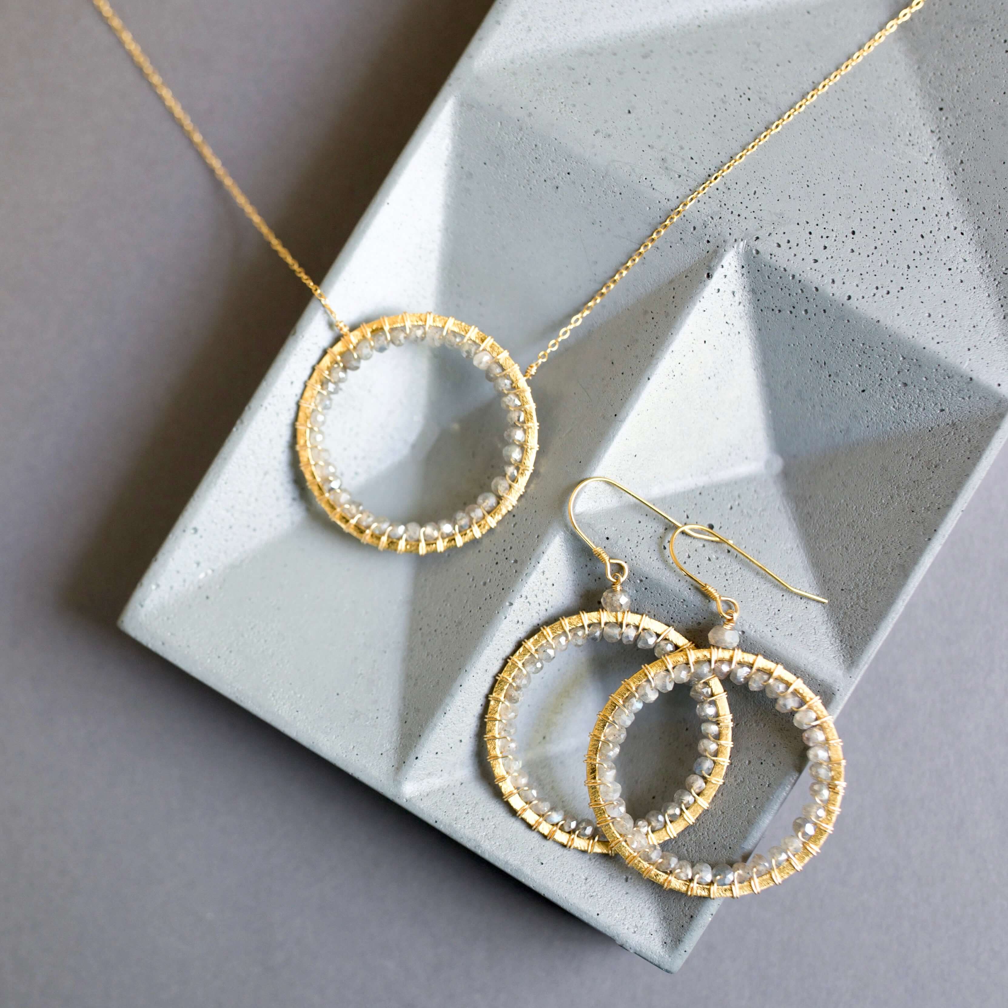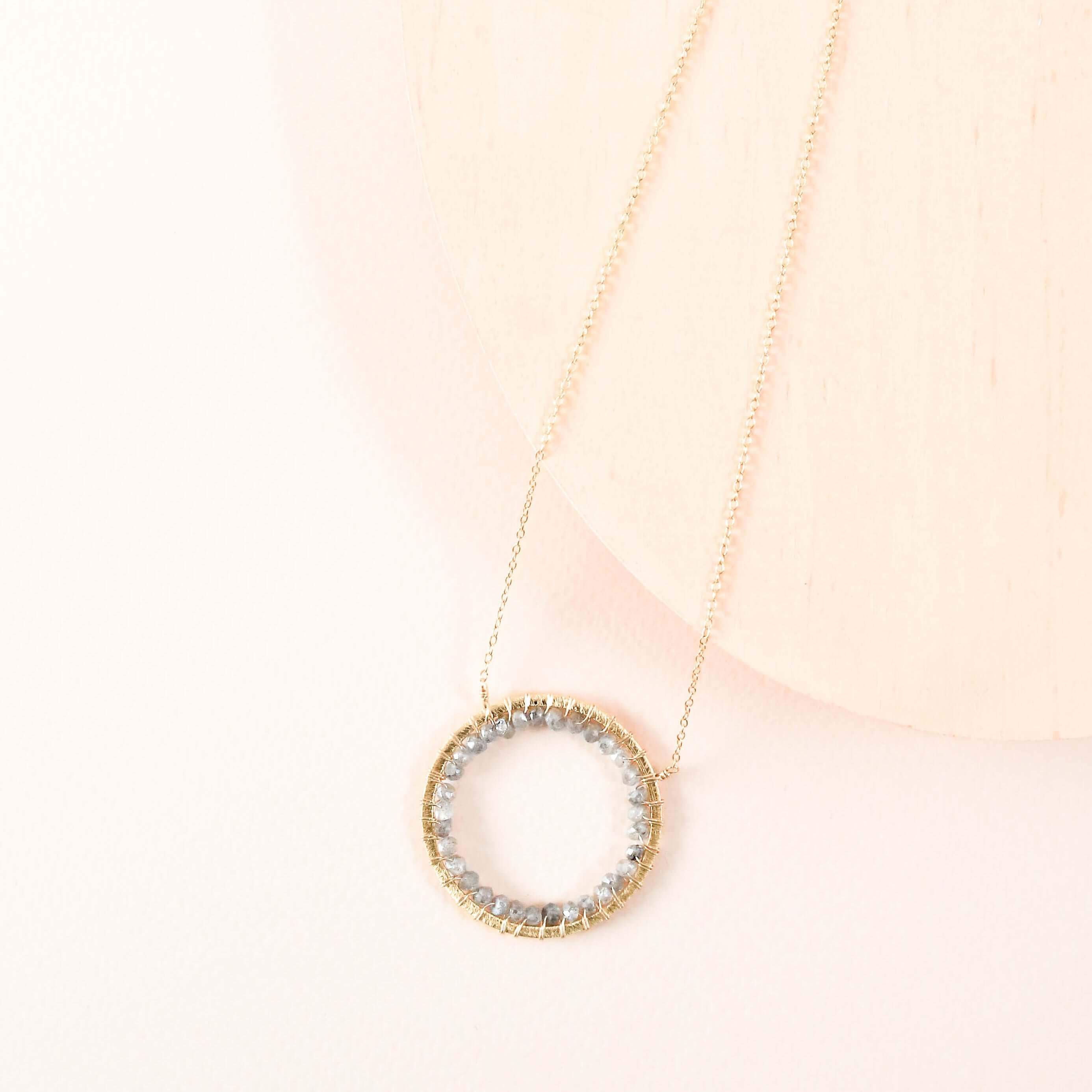 The Halo collection was our very first one. Intended to symbolize the intricate, universal energy woven within us all. This beautiful necklace is ultra lightweight and perfectly handmade featuring sparkling Labradorite gems woven into our unique floating pendant design.