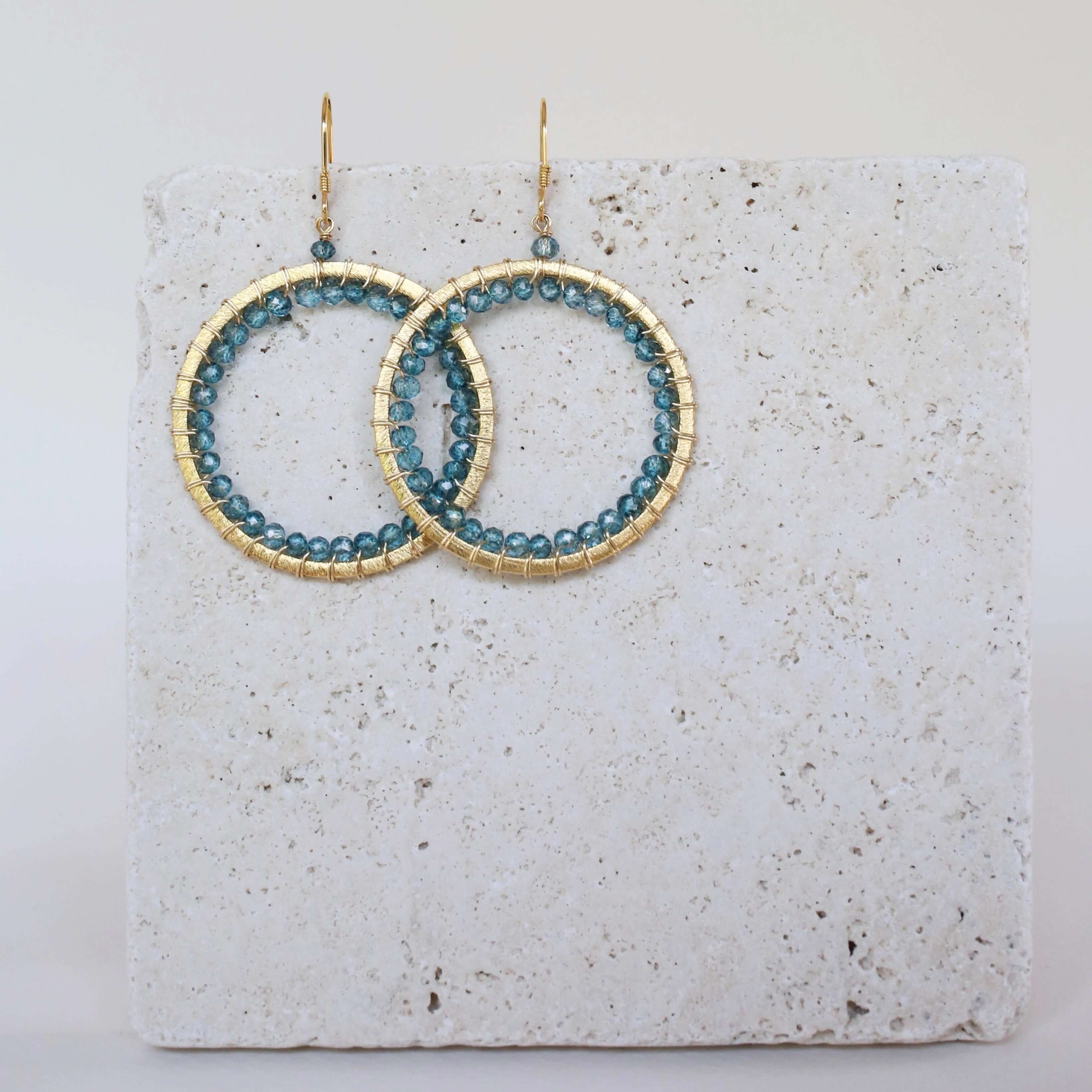 The Halo collection was our very first one. Intended to symbolize the intricate, universal energy woven within us all. These sparkling London Blue Quartz earrings are ultra lightweight and an eye-catching alternative to a traditional hoop.