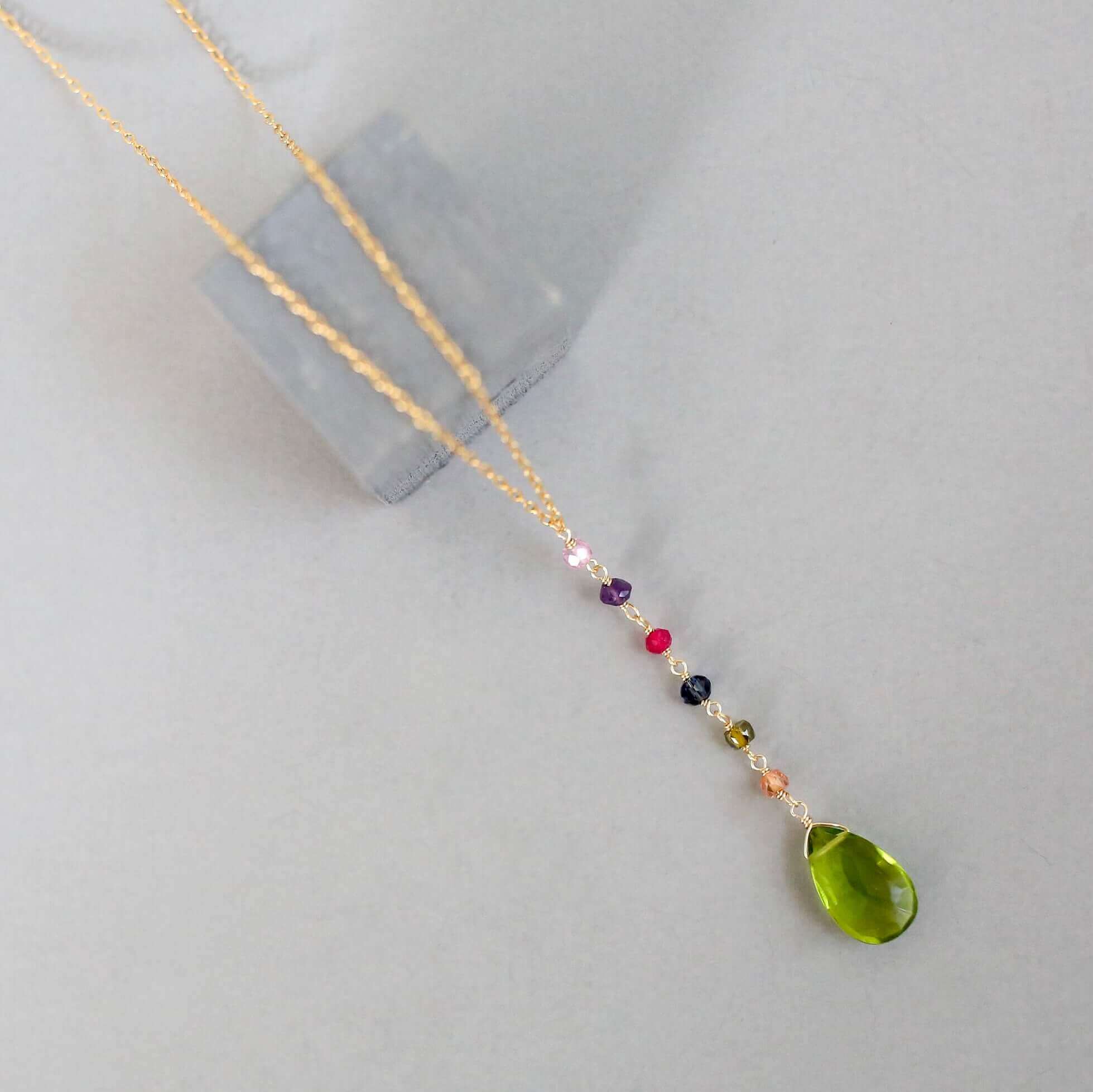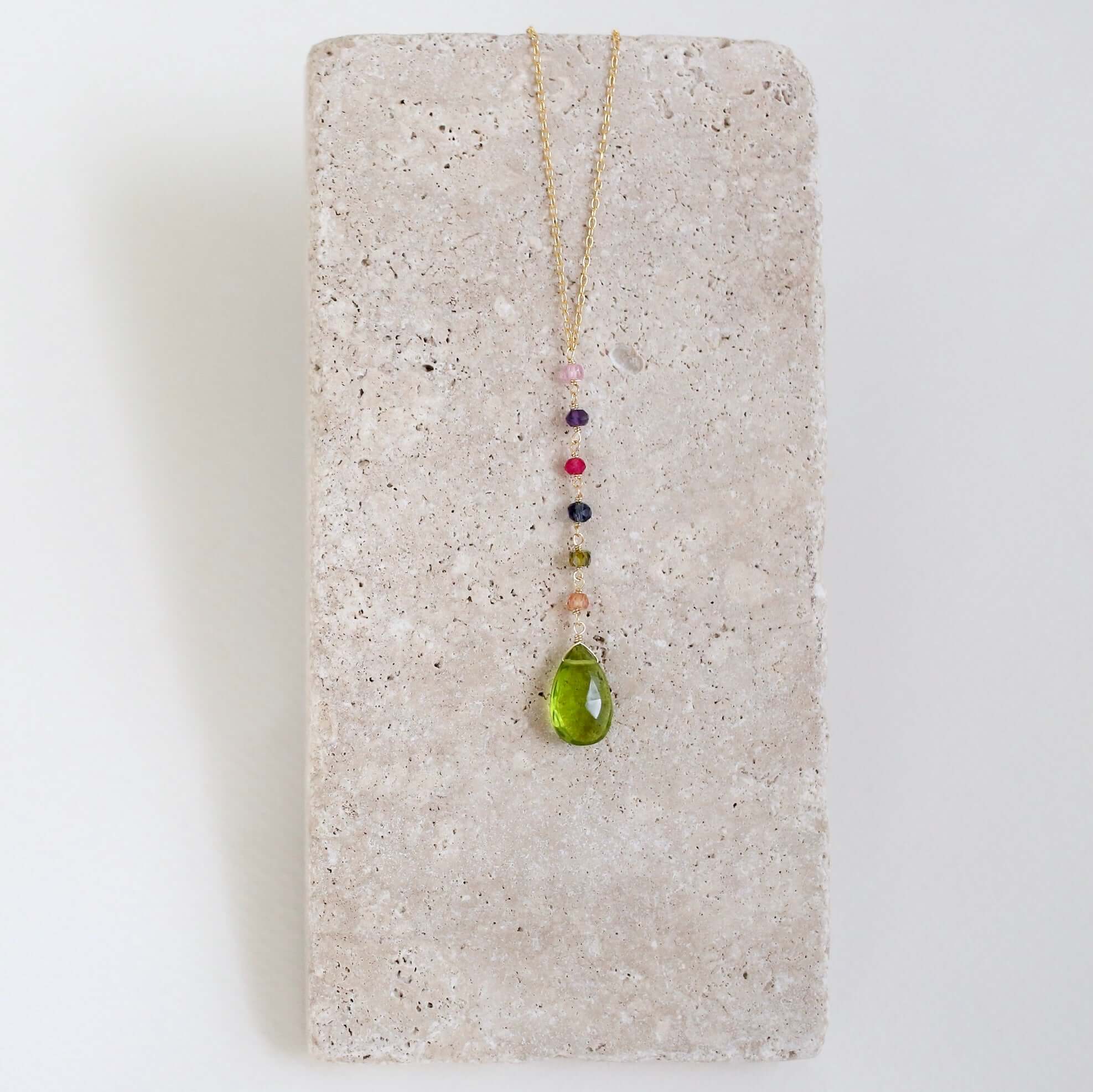 - Peridot Quartz gemstones paired with multi color accent stones- 18-20" long with a 2" extender chain