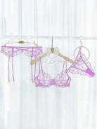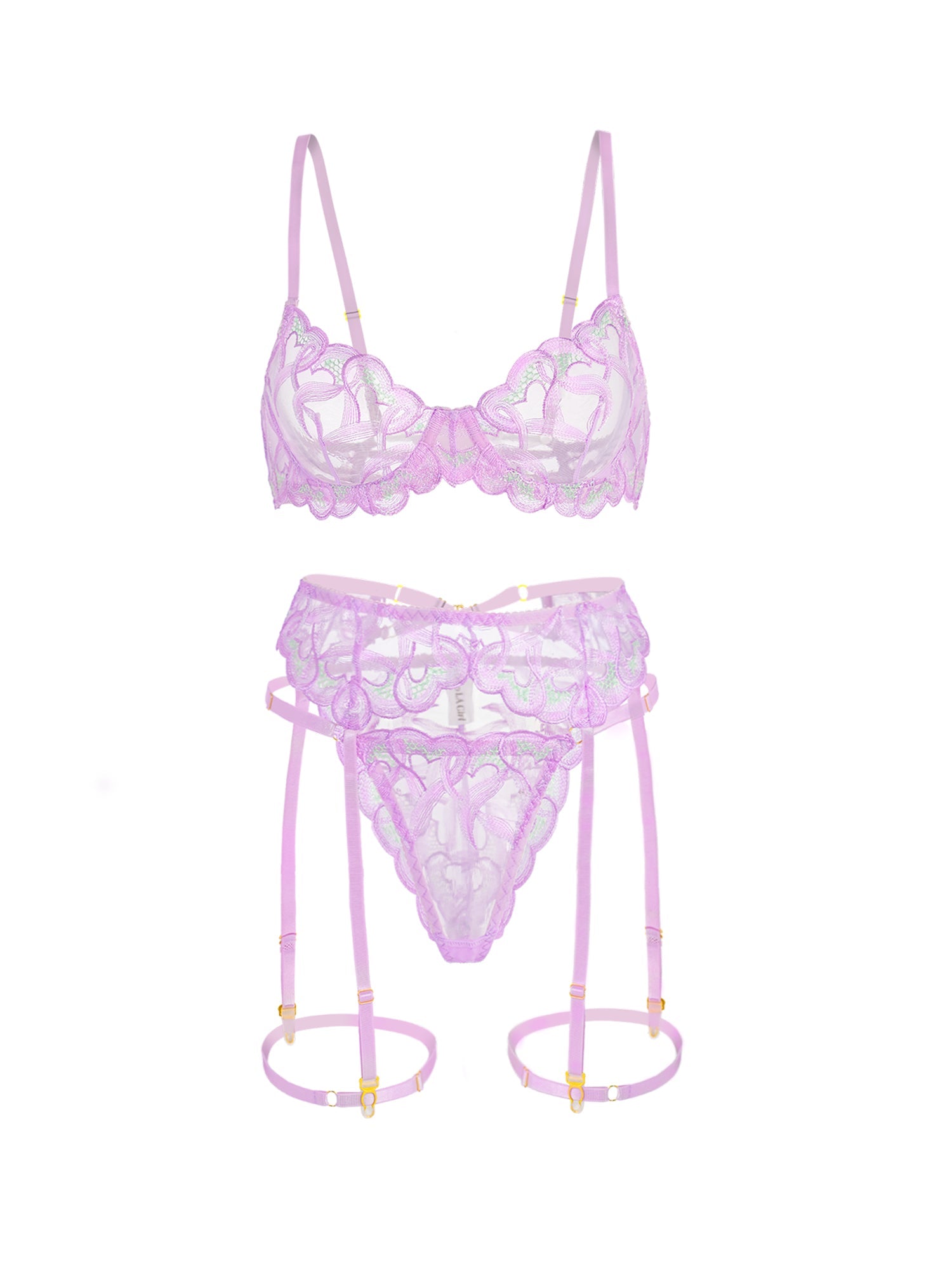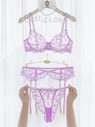 Discover allure in lavender with our sheer lingerie, adorned in love-themed embroidery. Seductive and elegant, each stitch whispers tales of passion. Elevate intimacy with our purple pieces, where transparency meets romantic design. Embrace confidence in our artfully crafted undergarments—a celebration of desire and elegance. 💜✨